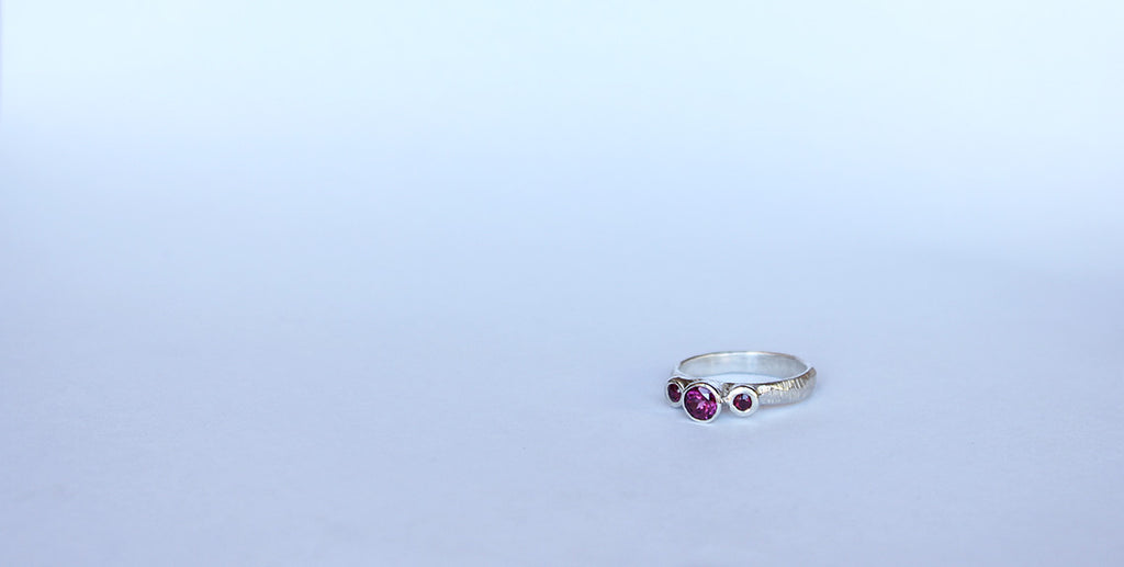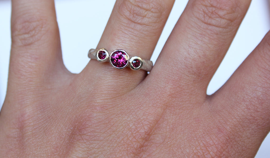 Featuring a centre 5mm Garnet and two 2.5mm garnets either side. In a beautiful pinky red. Clean setting details.